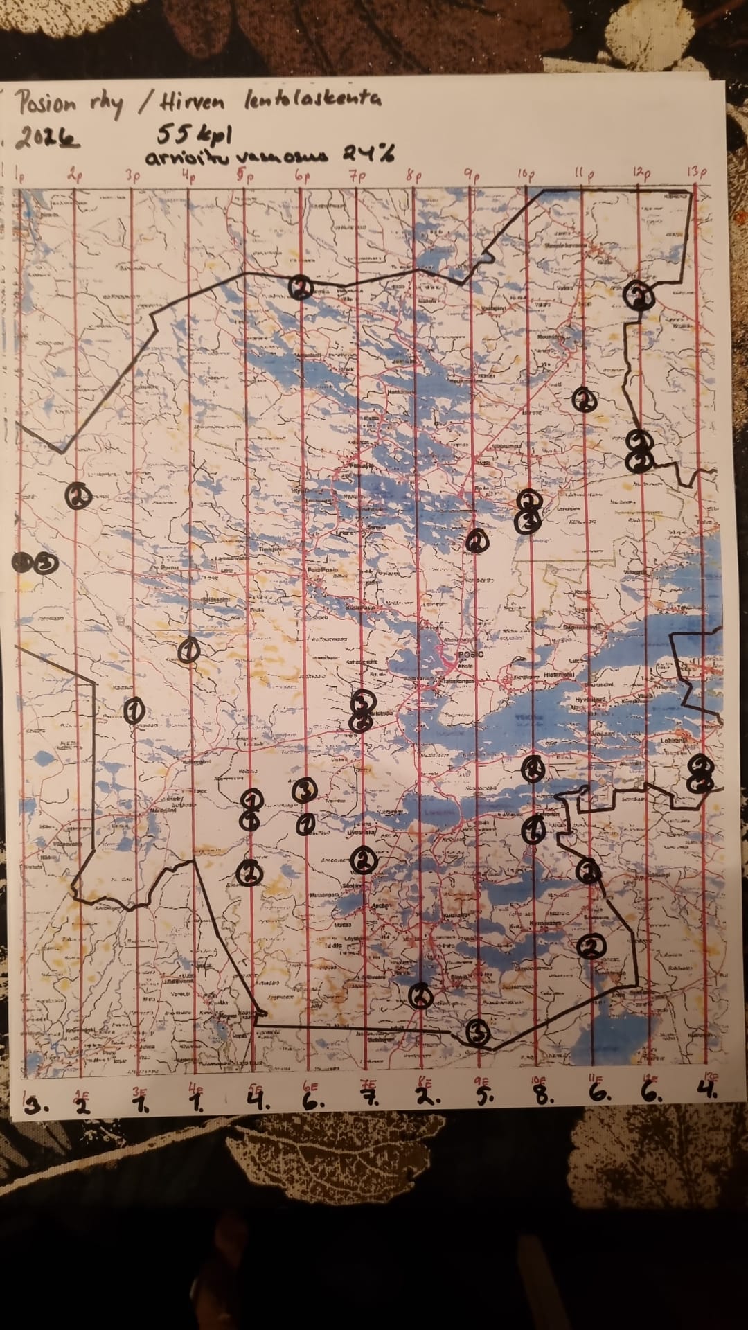 Lentolaskenta 2023 suoritettiin Posion Rhy:n ja muiden Lapin maakunnan eteläisten yhdistysten alueella Luonnonvarakeskuksen toimesta. Alla olevassa linkissä karta ja verrokkina edellinen Luken lentolaskenta